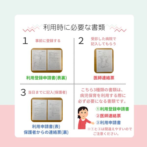 ①〜③の書類は病児保育を利用する際に必ず必要になる書類です。